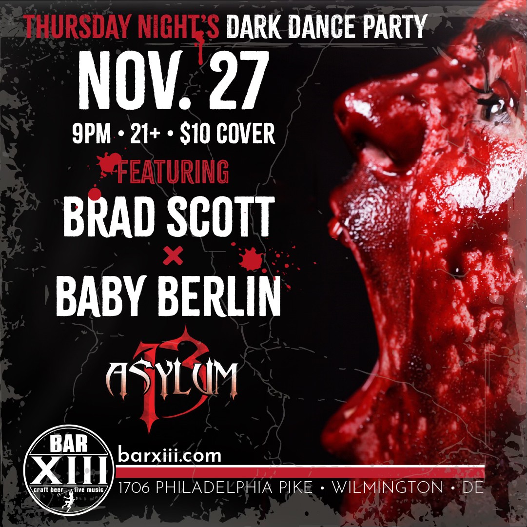 #Asylum13 #BarXIIIDelaware #BradScott #BabyBerlin #ThanksLiving #Darkwave #Industrial #GothNight #DarkDance #UndergroundMusic #PartyHappeningPeople