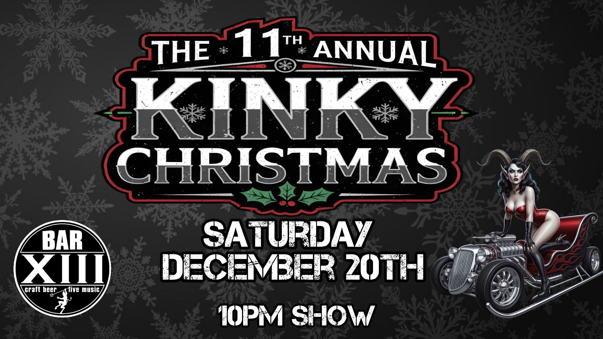 Everyone's favorite Holiday Show Kinky Christmas is back. It's the 11th annual Kinky Christmas at Bar XIII. Expect a night full of Music, burlesque, comedy, booze, and shenanigans.