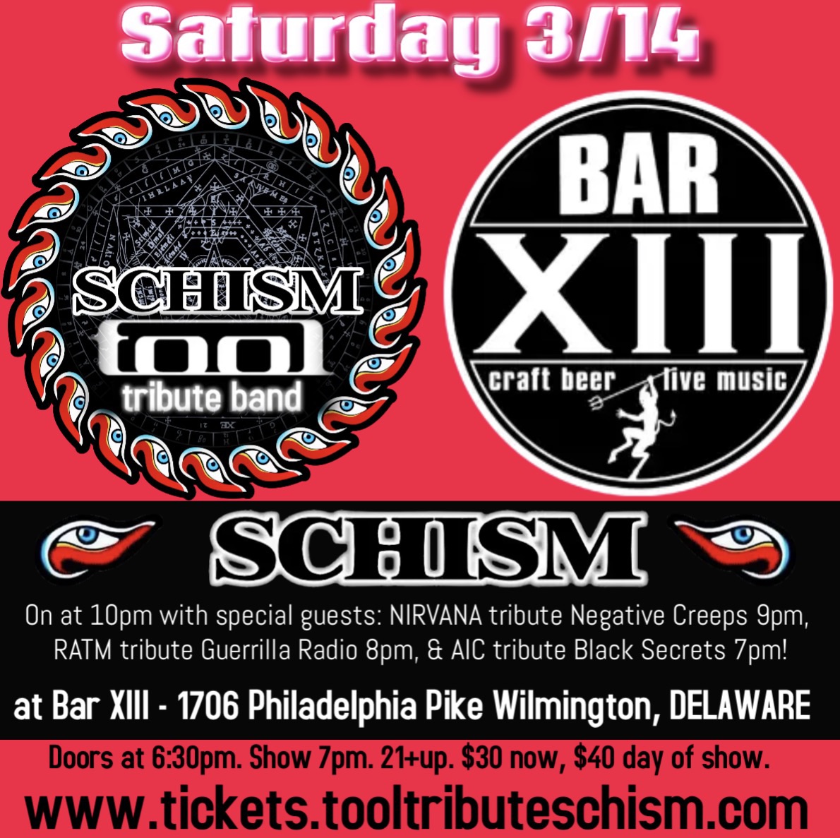 Nirvana tribute Negative Creeps at 9pm, RATM tribute Guerrilla Radio at 8pm, AIC trib Black Secrets at 7pm. Doors 6:30pm. 21&up. $30 now. $40 day of show. Schism’s 25th anniversary & final tour.